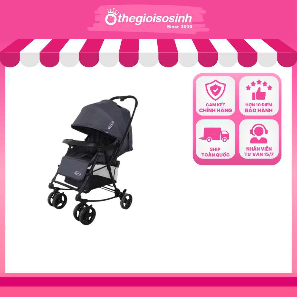 Khung xe chắc chắn, bền bỉ, ghế ngồi rộng rãi, đệm êm ái. Mái che lớn bảo vệ bé khỏi nắng, gió và bụi. Hệ thống bánh xe xoay linh hoạt, có giảm xóc và khóa an toàn giúp hành trình luôn êm ái, ổn định trên nhiều địa hình.